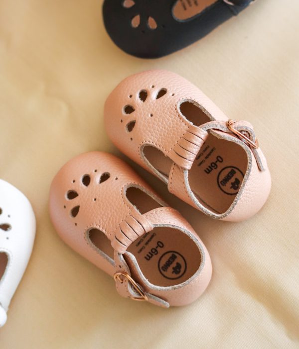 Zapato para bebé de cuero rosa nude. Forro y plantilla blanda 100% cuero. Hebilla de metal al costado (con elástico, no es necesario abrochar y desabrochar). Livianos, cómodos. (Suela de goma para tallas 12-18 y 18-24 meses).